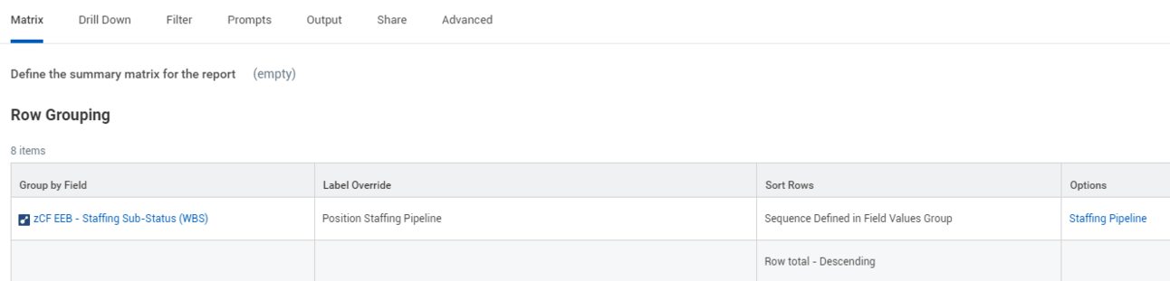 Under the Row Column section, add your newly created top-level calculated field, โzCF EEB - Staffing Sub-Statusโ. Retitle the Label Override to Position Pipeline so your end user will see a clean label as opposed to your calculated field nomenclature.