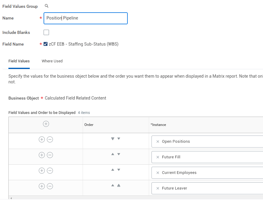 Name the Field Values Group, โPosition Pipelineโ, and add 4 line items. Select each of your custom labels by following this pathway: By Type > Evaluate Expression Band Calculated Field Related Content. Put them in this chronological order: Open Positions, Future Fill, Current Employees, Future Leaver. This โchronologicalโ order outlines the typical life cycle of a position.