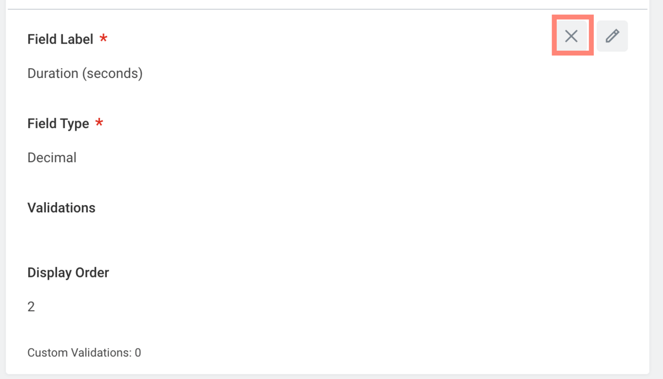 After inactivating, the custom field moves under the section “Removed (Inactive) Fields” with red x’s for clear visibility.