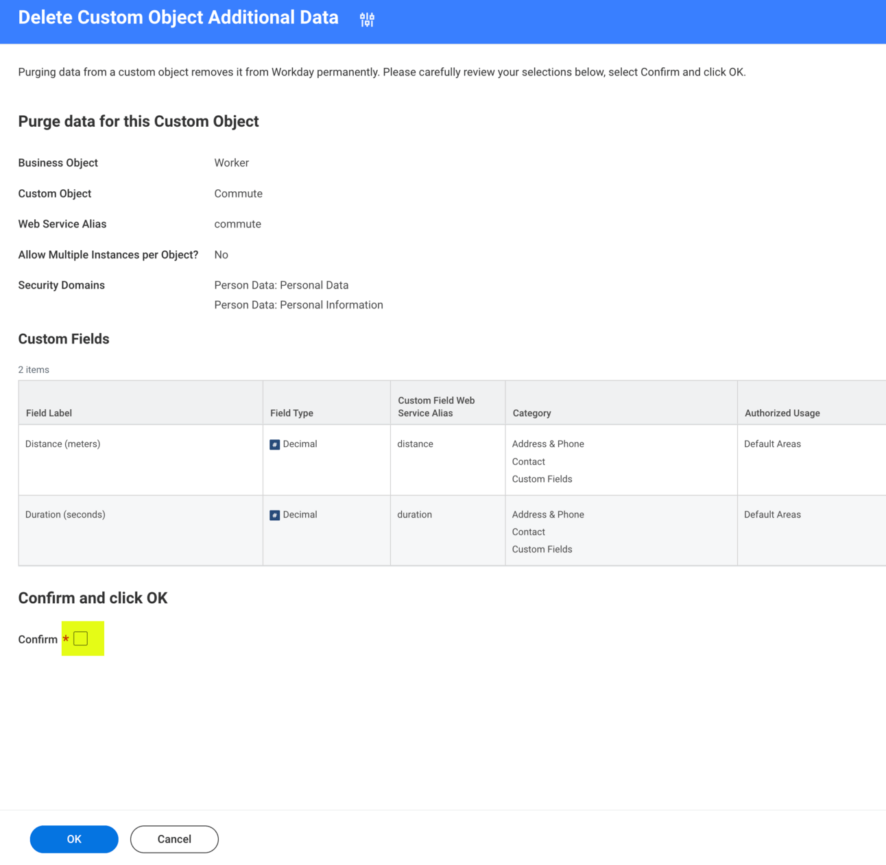 On the next screen, scroll until you see the Confirm checkbox. Select it, and click OK. If you click OK before this selection, Workday fires an error. This is your fail safe. It can be a big deal to wipe out this much data at once!