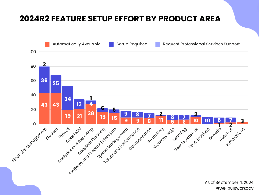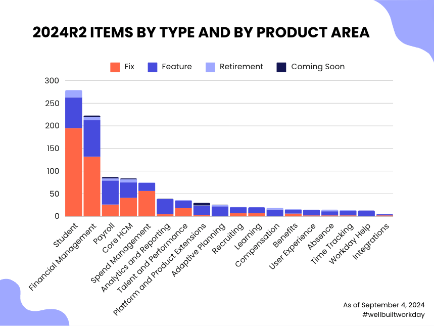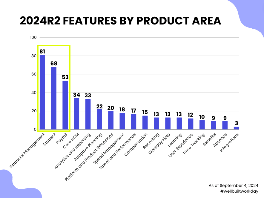 Immediately, you can see where Workday focused its product development this release. The Financials, Student, and Payroll products got the most love, together making up just under HALF (46%) of all 2024R2 features.