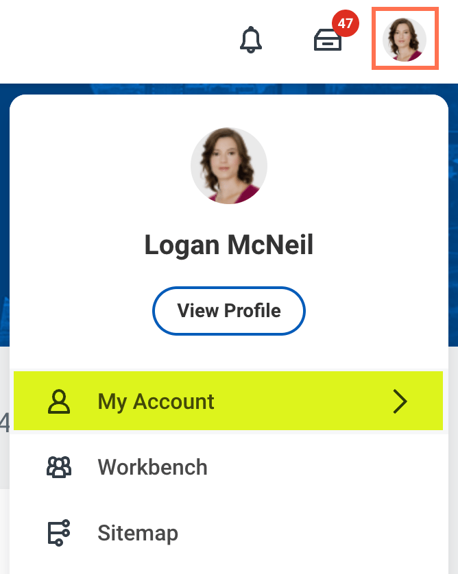 To begin, youโll start on desktop. On desktop, log into the testing tenant youโd like to connect to the mobile app. Click your profile photo in the upper right-hand corner, click My Account, then click Organization ID.