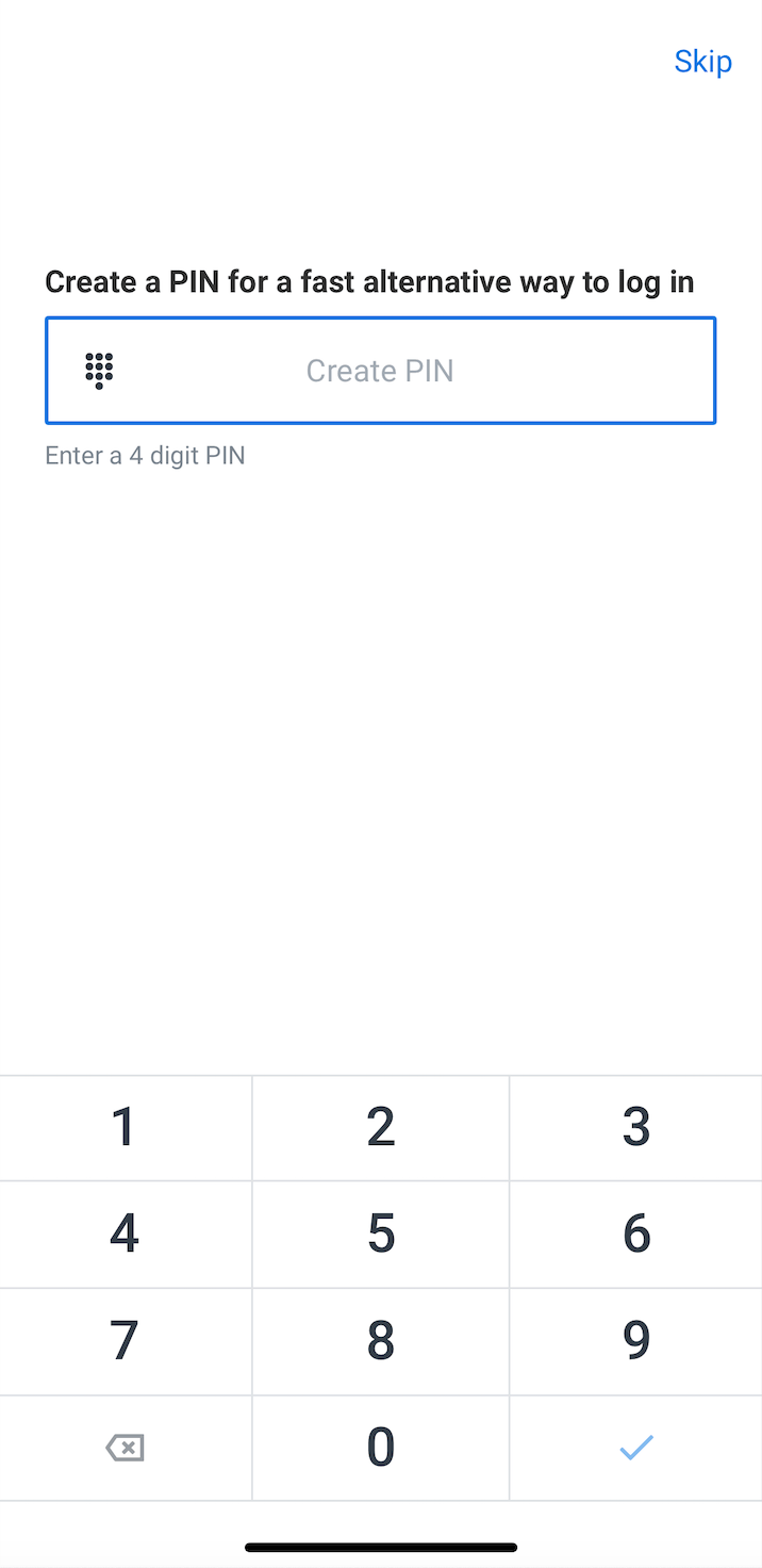 When you log into a tenant for the first time on mobile, you may encounter two screens to set up additional sign-on security measures including a biometric (like face ID) or a PIN.