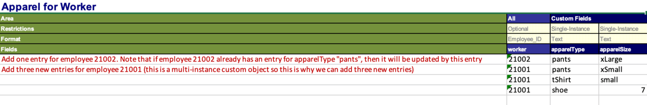 The template will have a column for the business object your custom object lives on (e.g., worker, job profile, etc.), and a column for every field on your custom object: