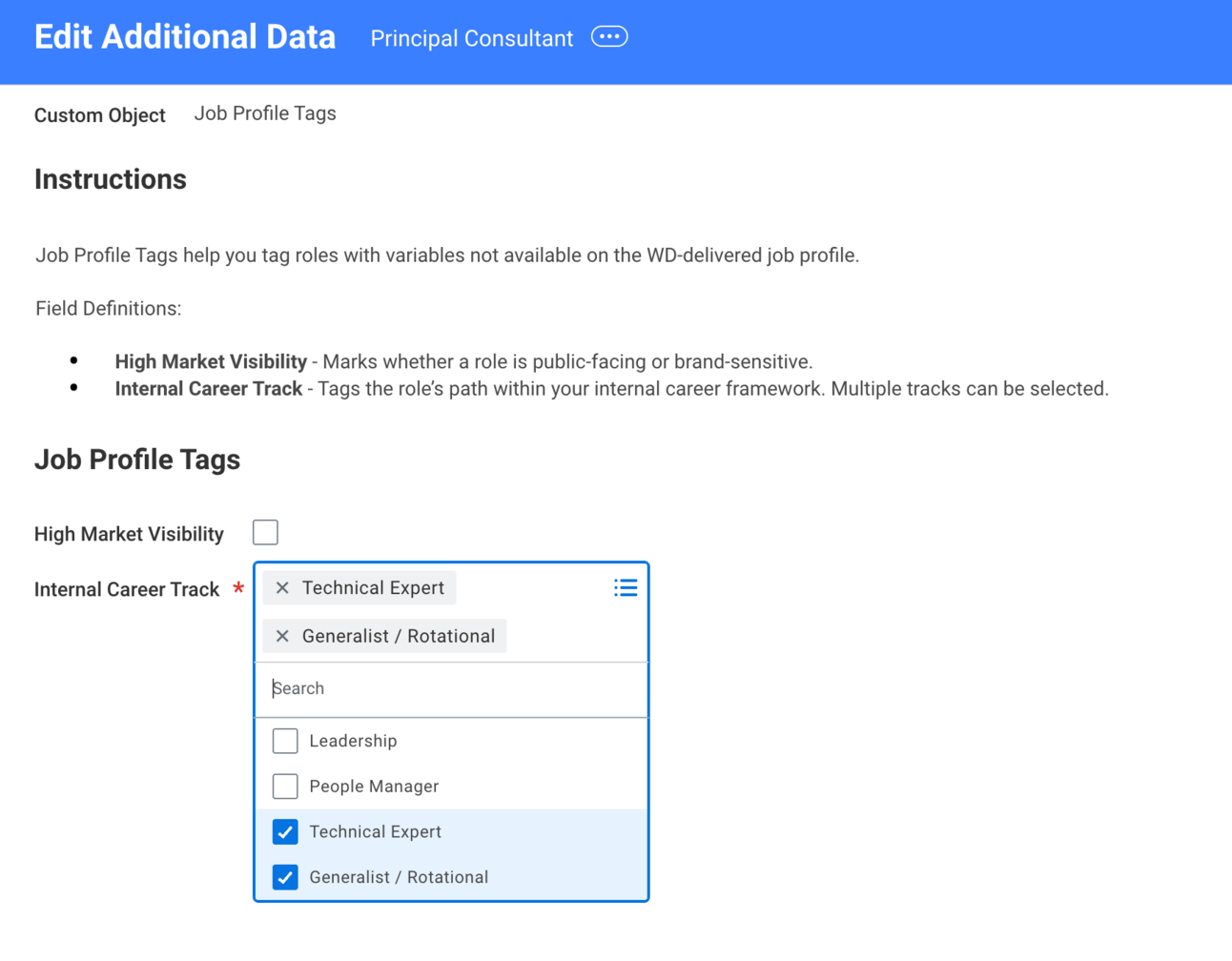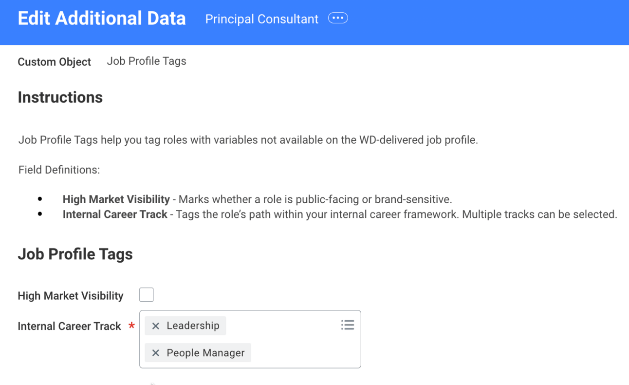 Recall the Internal Career Track field. There are 4 tracks to choose from, but letโs say your orgโs policy is every job profile should have a maximum of 2 tracks. To enforce this policy, configure a Custom Object Validation.