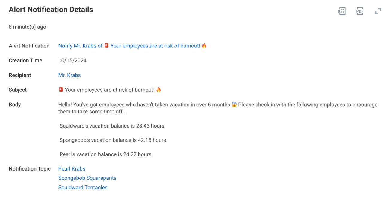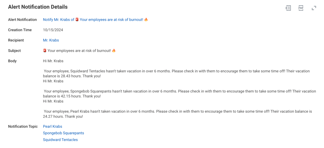 In the example above, there were 3 notification topics (3 workersโSquidward, Spongebob, and Pearl), and the notification was sent to one recipient (one manager, Mr. Krabs).