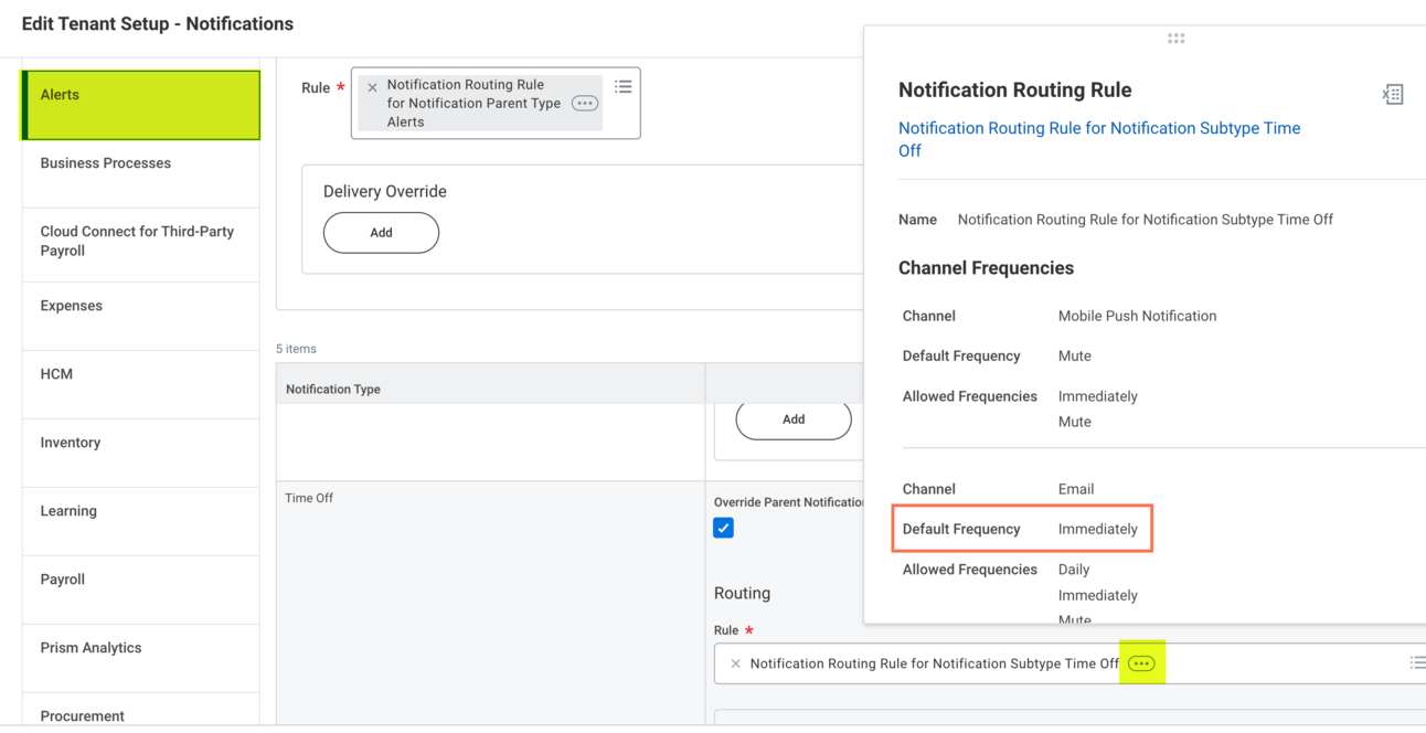 To explore your Notification Routing Rules, run the task, โEdit Tenant Setup - Notificationsโ. Click on the โAlertsโ tab, then click the related actions button on your Routing Rule of interest. Check out the Channels, Default Frequency, and Allowed Frequencies on each rule: