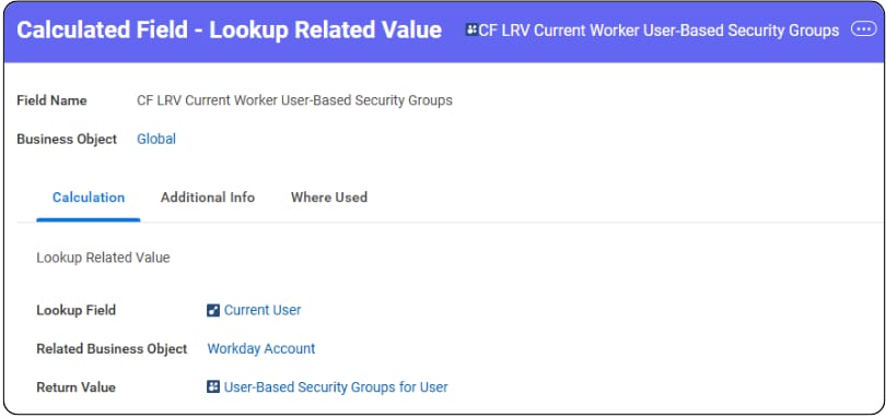 The second line of logic is powered by a Lookup Related Value calculated field. For source field, select CF LRV Current Worker User-Based Security Groups, and for the comparison value, select HR Administrator.