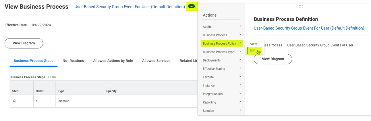Click on the related actions button on the business process, hover over โBusiness Process Policyโ, and click โEditโ.