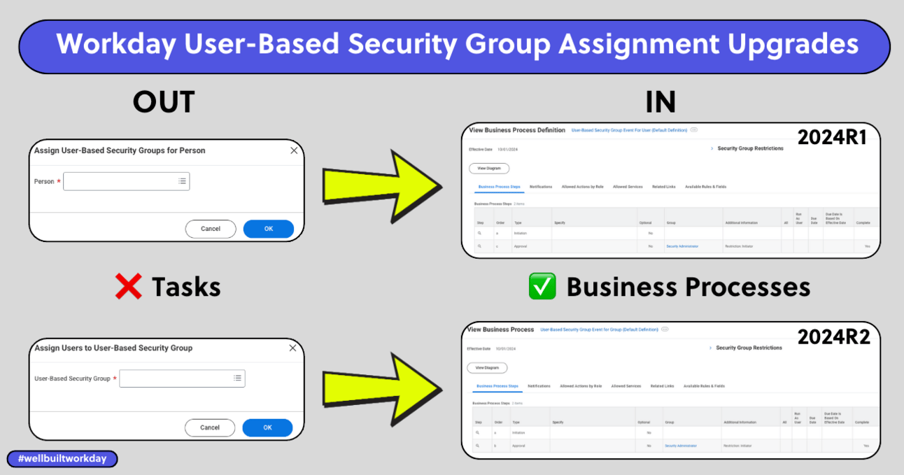 With 2024R1 and 2024R2, Workday released two new business processes that replace the old, non-workflow-enabled tasks for assigning user-based security groups. With these business processes, we say goodbye toโฆ