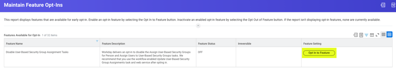 Navigate to the task, โMaintain Feature Opt-Insโ, find the โDisable User-Based Security Group Assignment Taskโ item (filter the column to be speedy!), and click the โOpt In to Featureโ button: