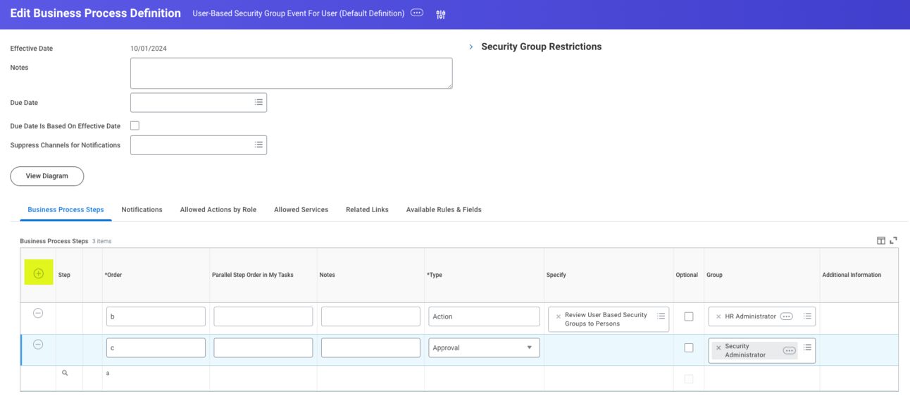 Add your business process steps per your organizationโs defined policy. Click the โ+โ button to add rows. The permissions you set up in Step 4 on the BP security policy determine which steps you can assign to which security groups.