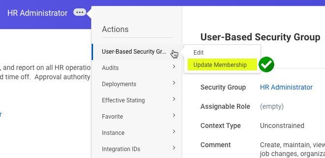 By disabling the existing tasks, all user-based security group assignment changes will go through the new business process. To confirm youโve successfully disabled the tasks, check the related actions on a user-based security group. Only one initiation option should remain, โUpdate Membershipโ: