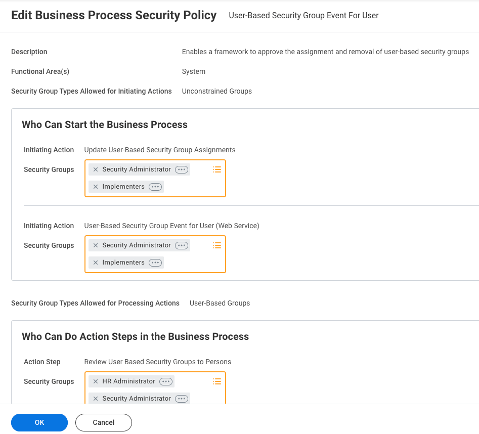 Configure the permissions on the business process security policy at your organizationโs discretion (as you planned in Step 1!). To keep things simple, I recommend leveraging the Security Administrator and/or HR Administrator security groups.