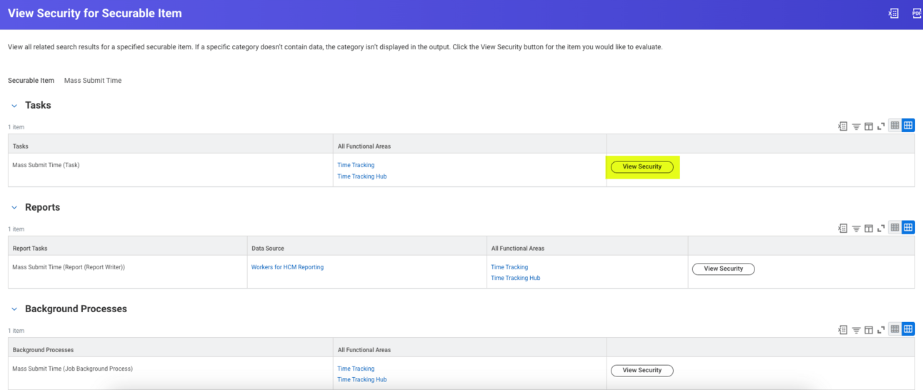Click the “View Security” button on each Task, Report, and Background Process to review the domain(s) that secure the task.