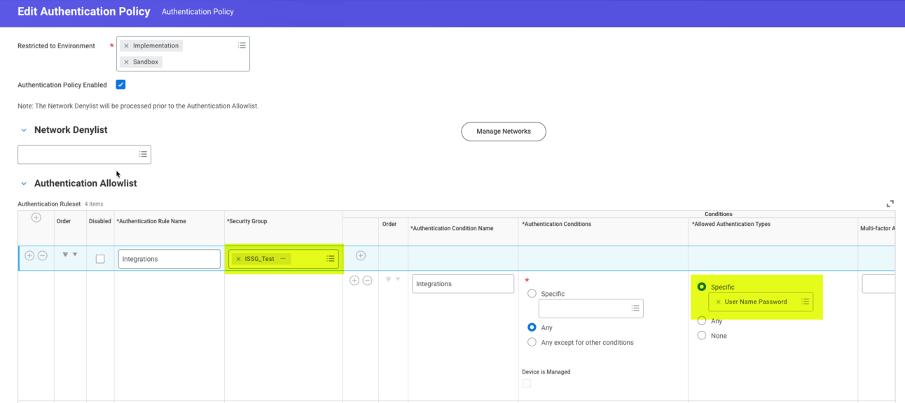 Run the Manage Authentication Policies task and edit the policy for your test environment. If the policy already has a rule for integrations or APIs to log in by username/password, add all of your new ISSGs in the “Security Group” input. If it doesn’t, you can add a rule as follows: