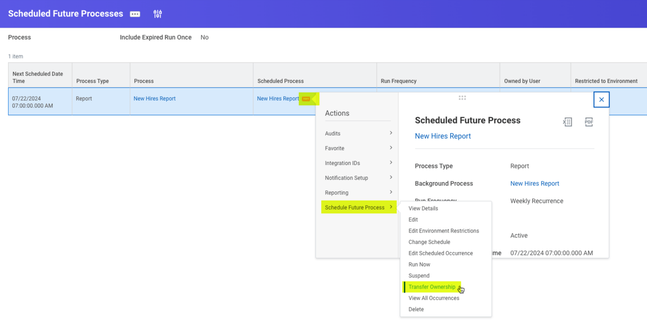Next, you can finally transfer ownership of scheduled future processes. Unfortunately, this is a tedious, manual process—ownership is transferred one process at a time.