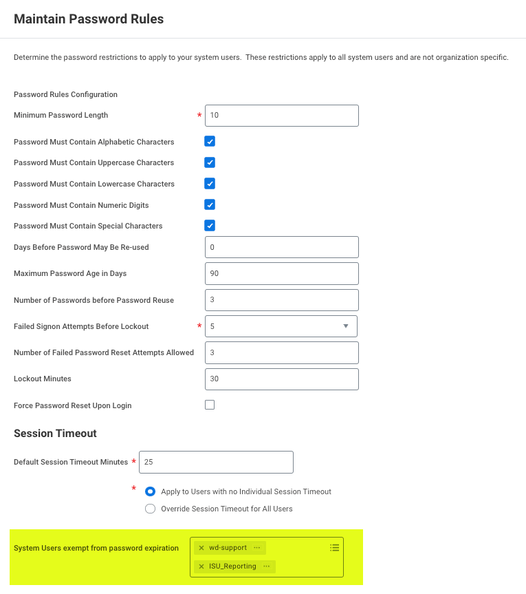 Once you’ve created all your ISUs, run the task, Maintain Password Rules. Add your new ISUs to the “System Users exempt from password expiration” input to ensure that your ISUs never expire.