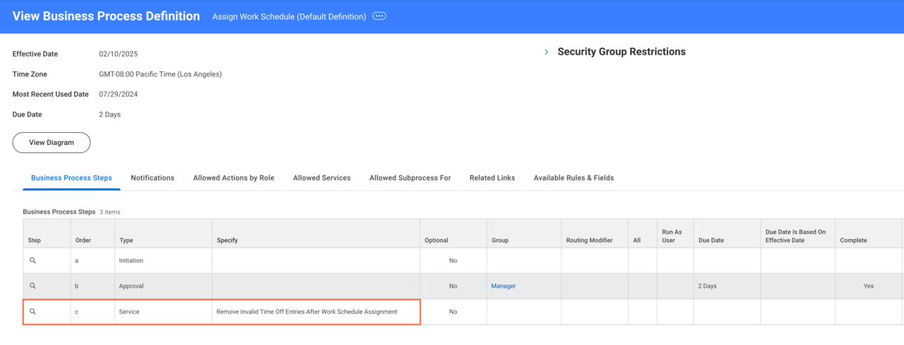 Setup: On the Assign Work Schedule business process, add the โRemove invalid Time Off Entries After Work Schedule Assignmentโ service step after the Completion step.