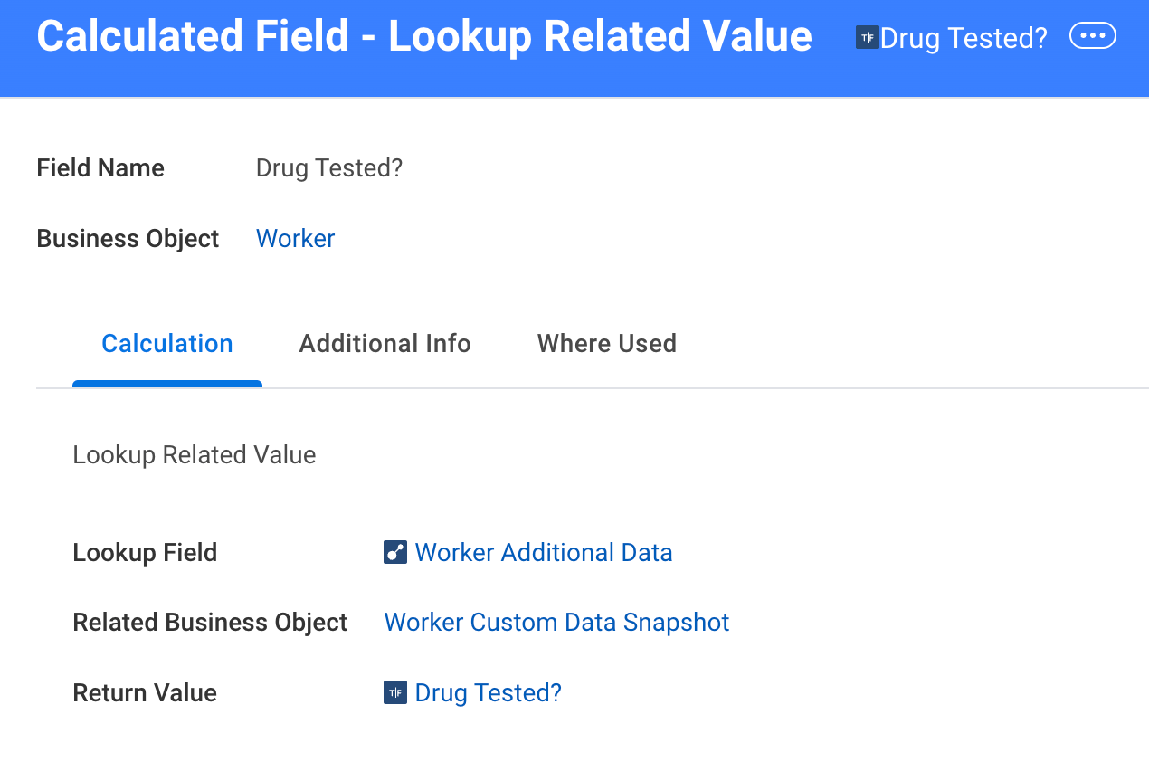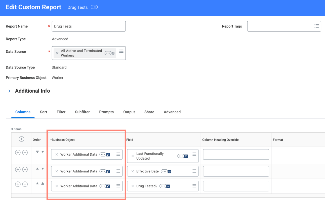 Custom objects’ fields common to an extended business object share a related business object for the object they extend. For the Worker object, this is “Worker Additional Data”.