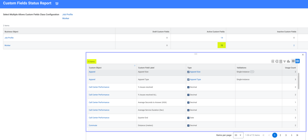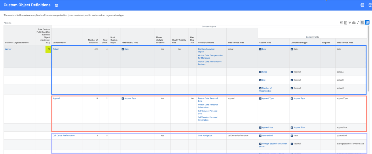 The report “Custom Object Definitions” report run for the Worker (non-effective dated) and Worker (effective-dated) BOs.