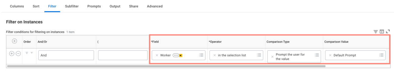In the examples above, the object is Worker. Pull the object into the field input, then set the Operator to “in the selection list” and the comparison type to “Prompt the field for the value”.