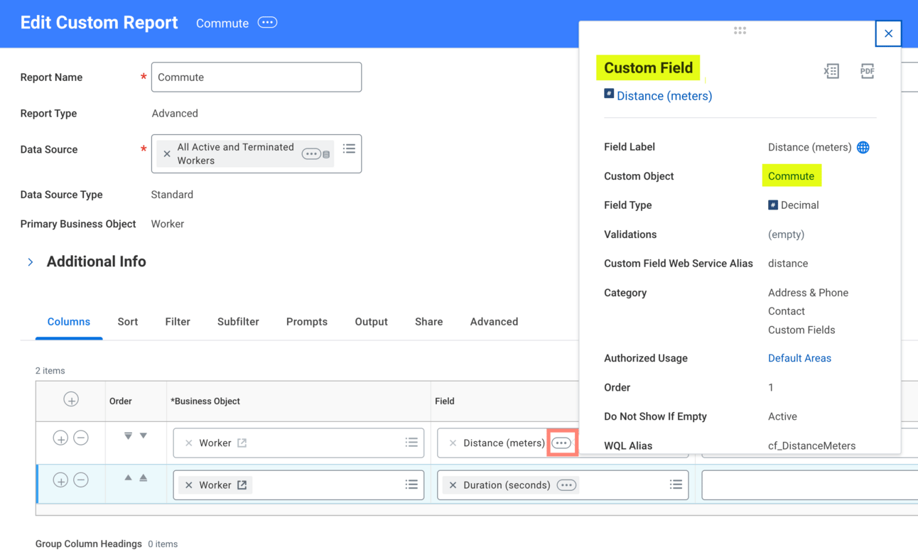 For example, the non-effective dated custom object “Commute” has a custom field for “Distance (meters)”. Since it does NOT allow multiple instances and there’s only one possible instance value, you can search and select this field directly from the Worker business object.