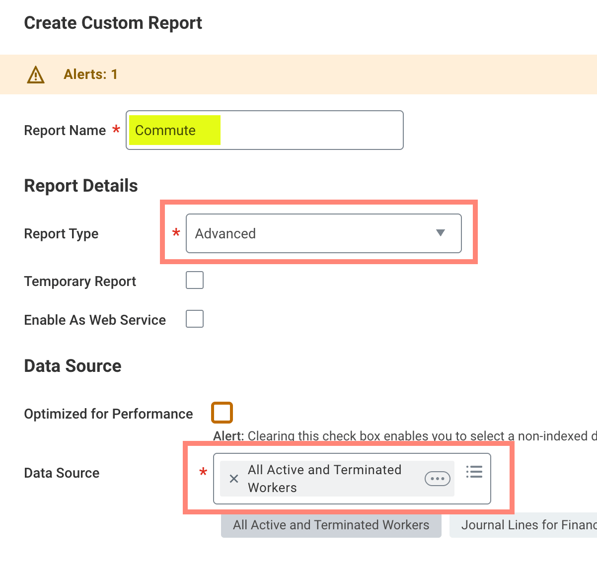 Select a datasource that connects to the extended object. In this case, we select “All Active and Terminated Workers” to report on Worker custom objects.