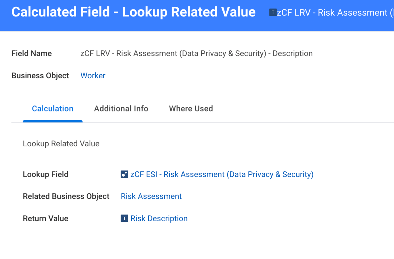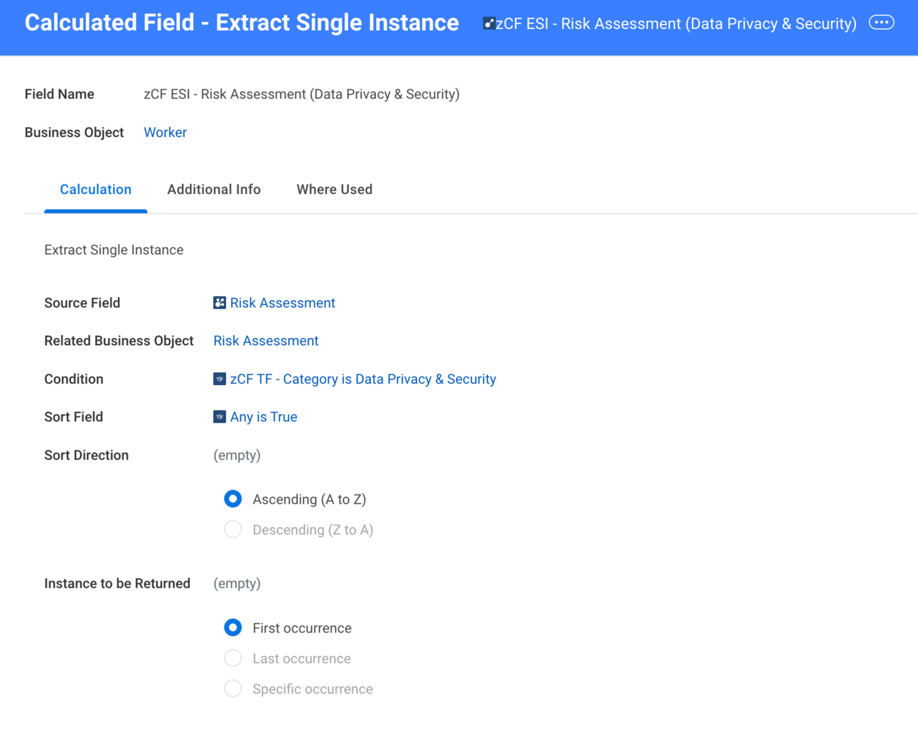 For example, the non-effective dated custom object “Risk Assessment” allows multiple instances. Replace the default Worker business object with the Risk Assessment multi-instance field to access its custom fields.